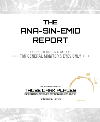 'The Ana-Sin-Emid Report' is an official adventure for 'Those Dark Places Industrial Science Fiction Roleplaying' published by Osprey Games.